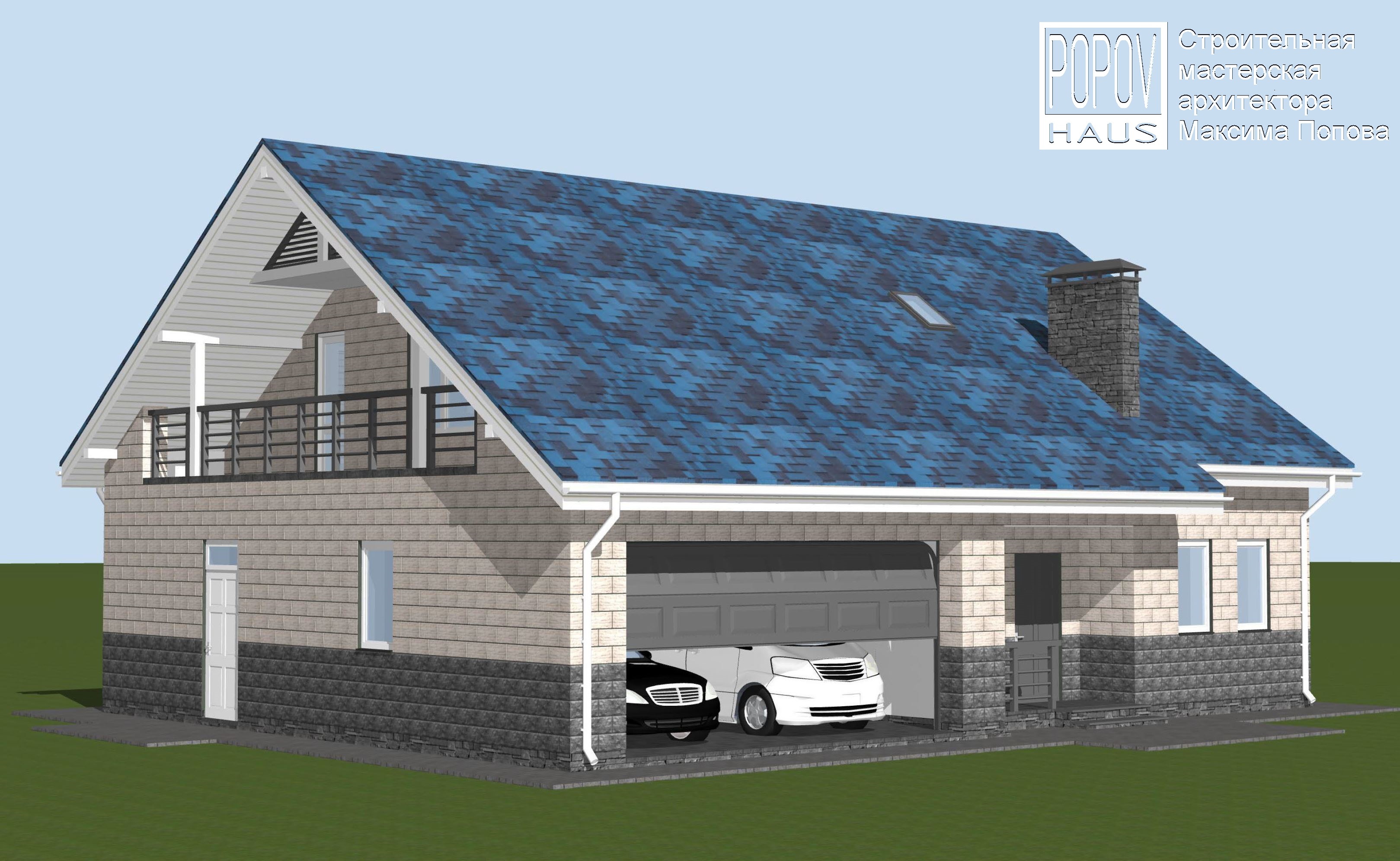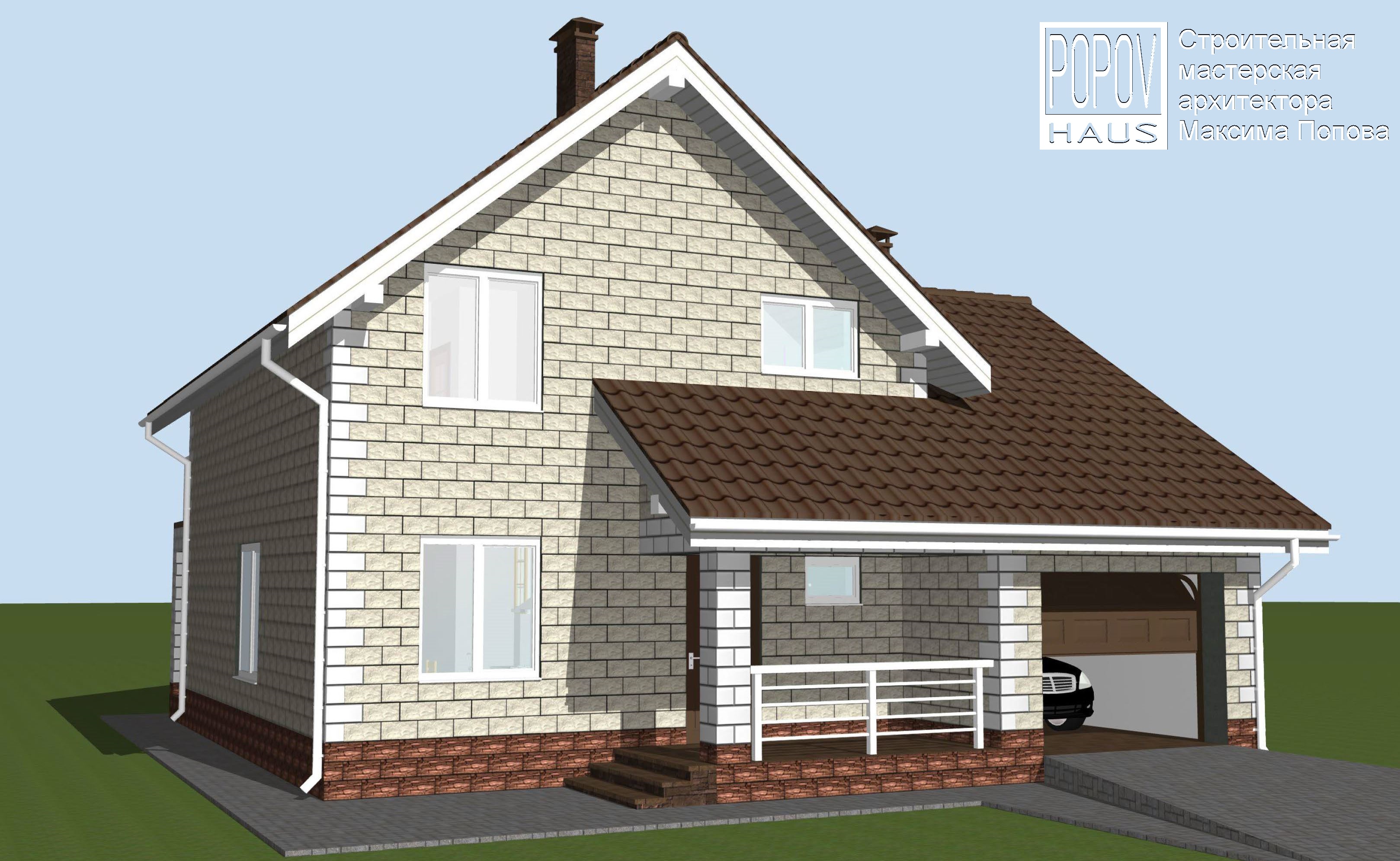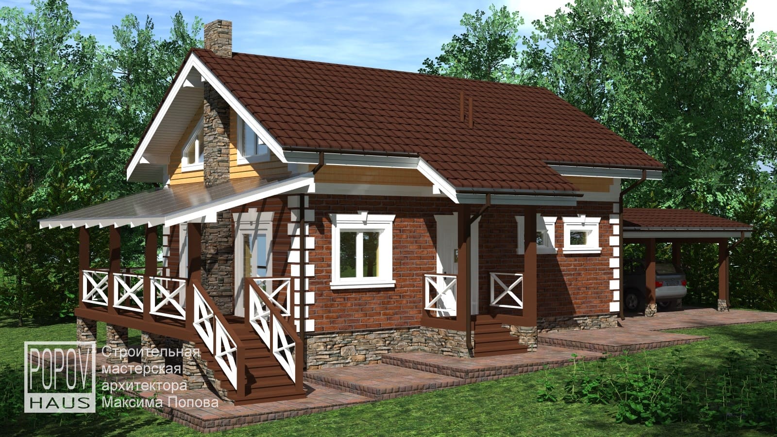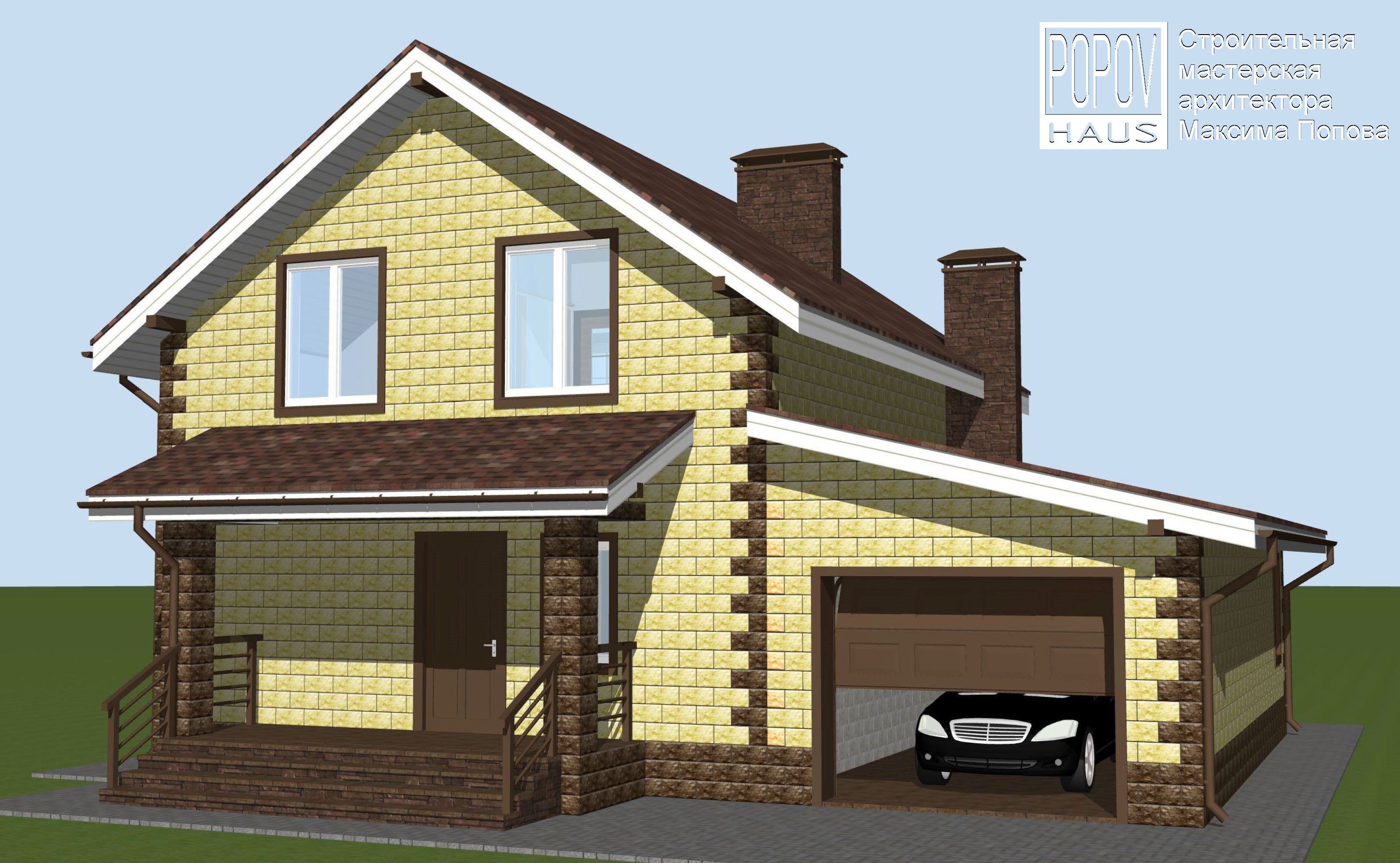 Экстерьер проекта банного комплекса с навесом для 2-х авто на 155 м2